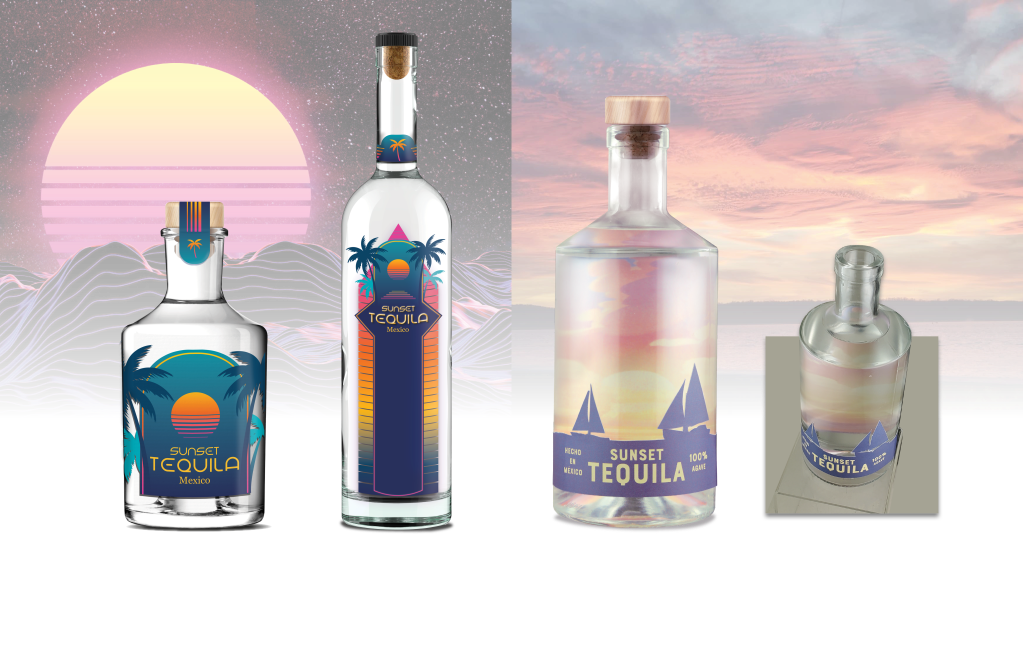 Developed as a cutting-edge new tequila brand for Monsieur Touton, these two variants seek to target the younger demographic of hip drinkers. One is wild and synthwave; designed for partying. The other is soft like a quiet sunset. The back label of the second design is double-sided, allowing full color artwork to be viewed from multiple angles. Proposed as an appeal to a young demographic increasingly interested in soft comforting visual aesthetics.