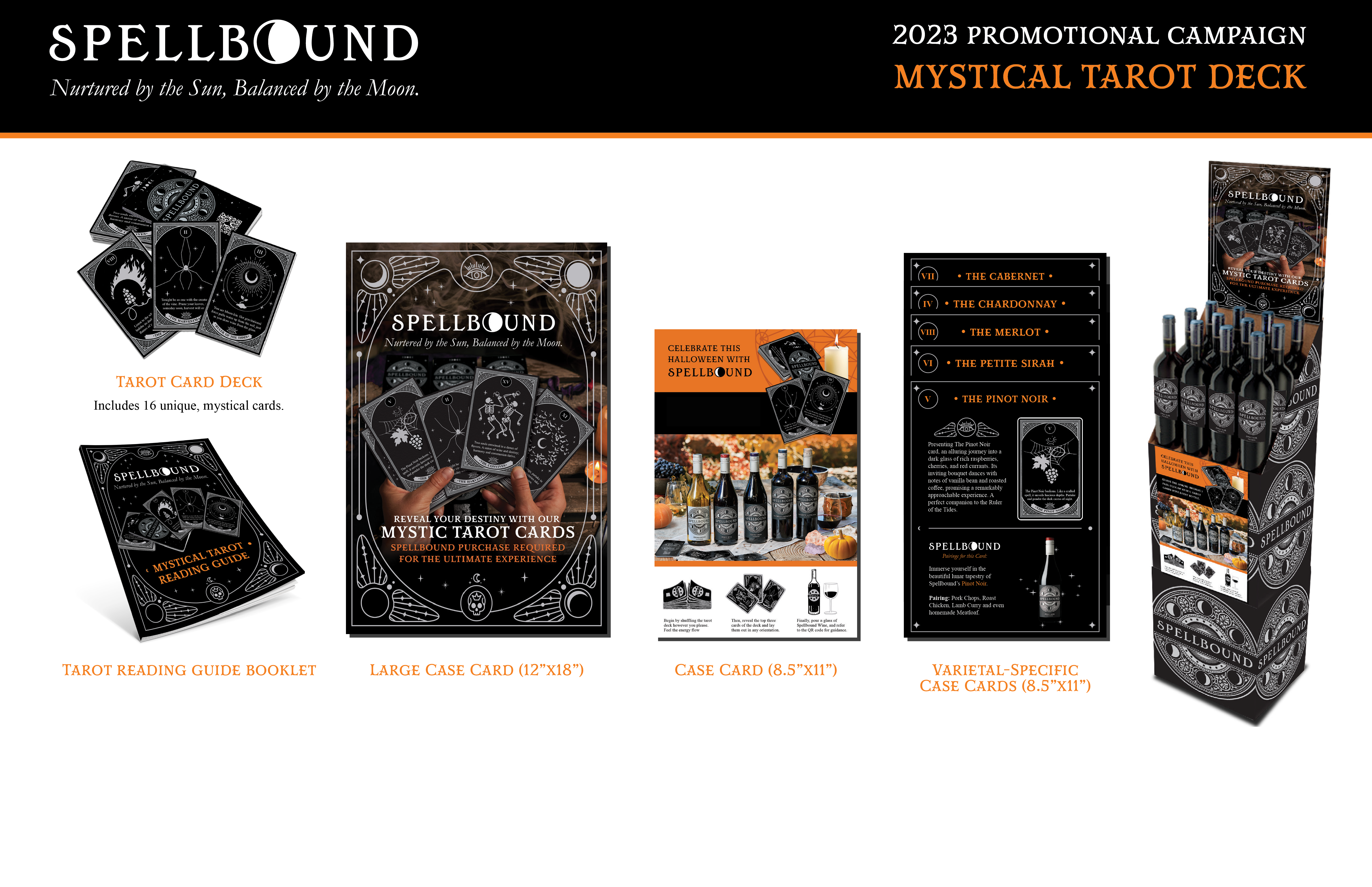Promotional Halloween campaign, featuring a deck of tarot cards designed to tell fortunes relating to Spellbound’s wine portfolio. In addition to physical material, the reading guide was digitally integrated via the QR code on the cardbacks. I led design, print production and shipping to distribute materials to dozens of liquor stores across the East Coast.