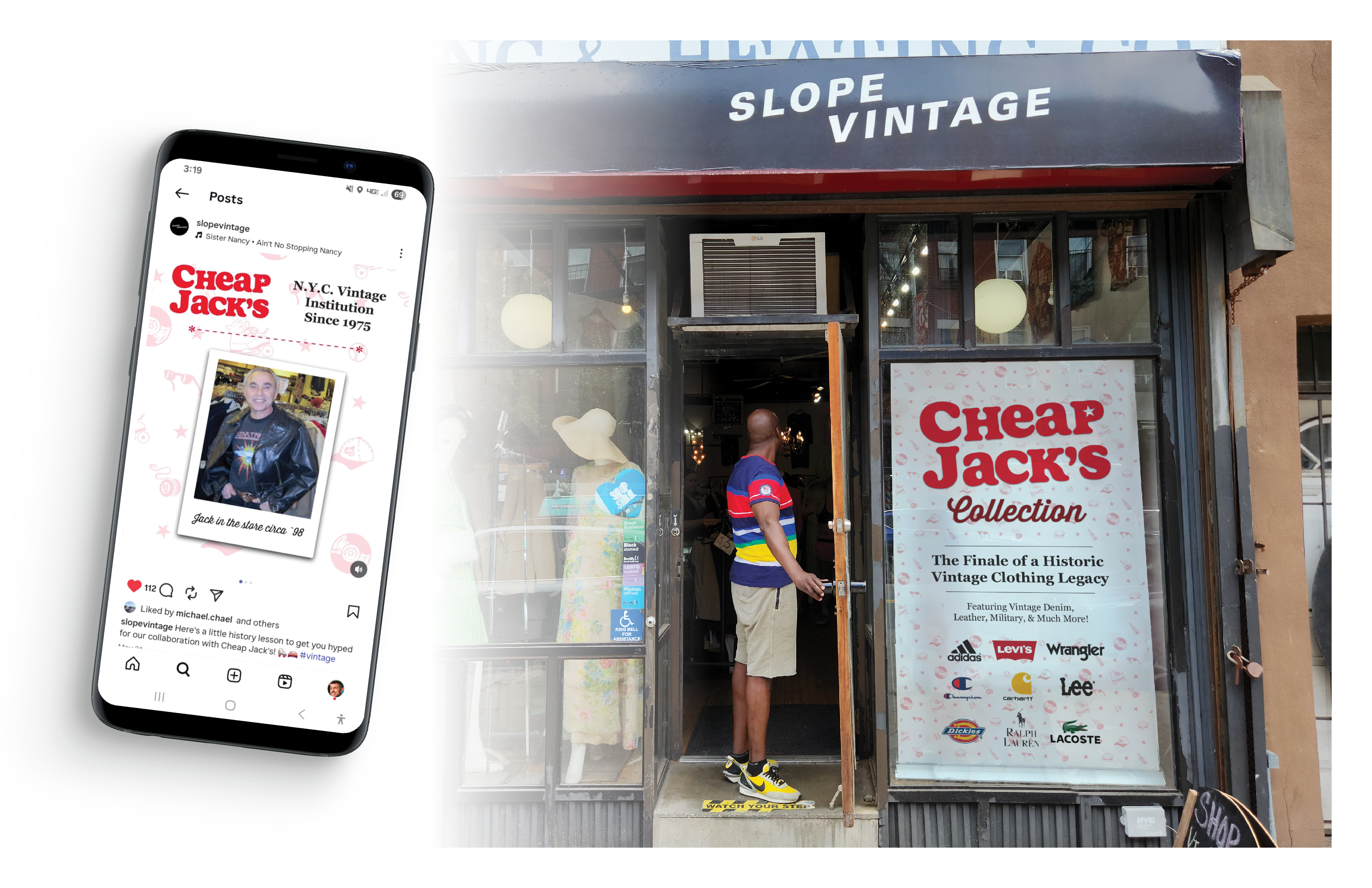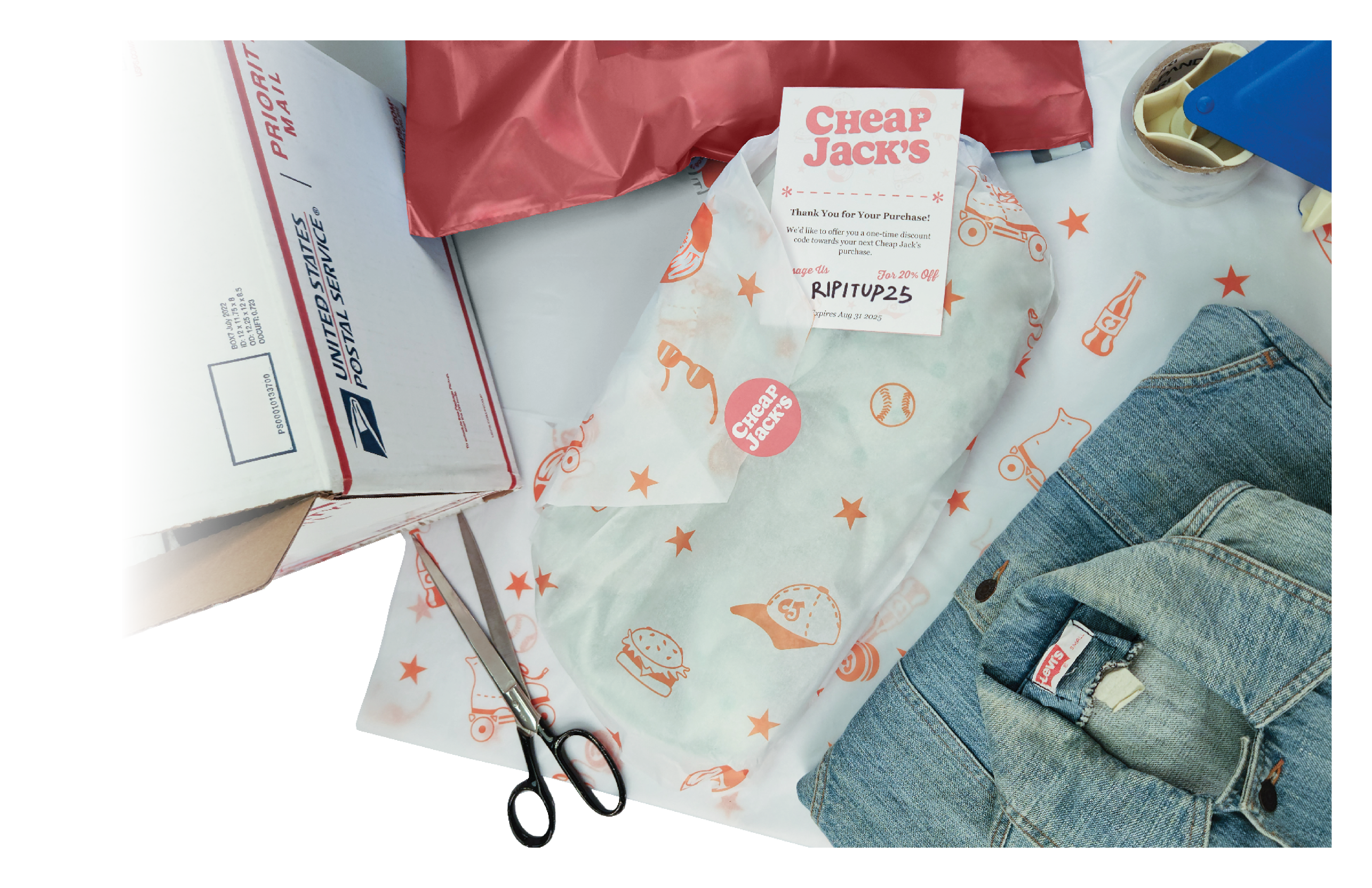 Cheap Jack’s was a vintage clothing empire in NYC since 1975, and I was brought on to design material for the final liquidation of inventory collab with Slope Vintage. Print & digital ads, and a brand makeover were ordered. To support the liquidation of Cheap Jack’s collection, I created online retail packaging, including custom tissue paper, stickers, promo codes and mailers.